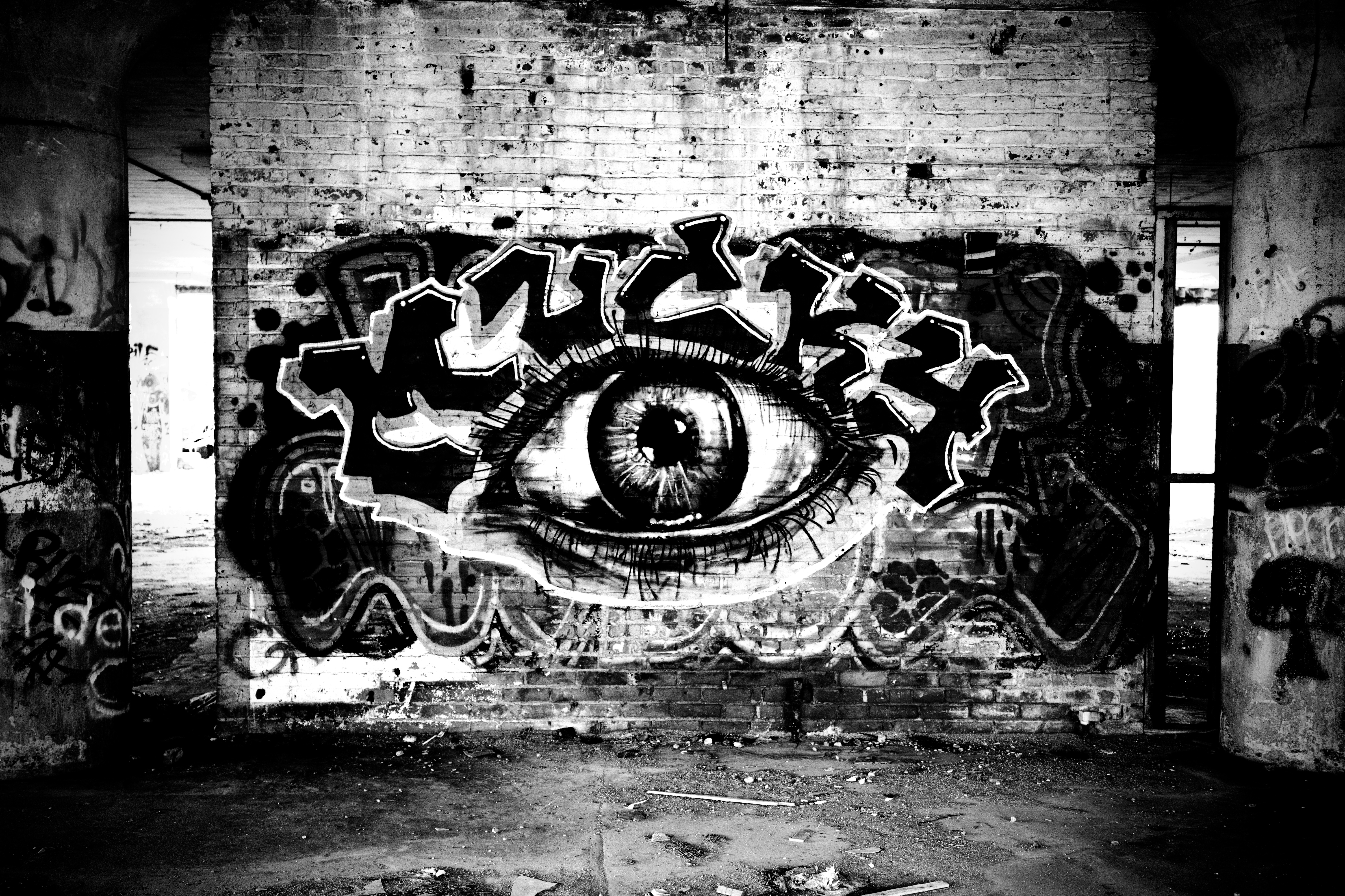 Graffiti of an eye on a brick wall by Mucky.
