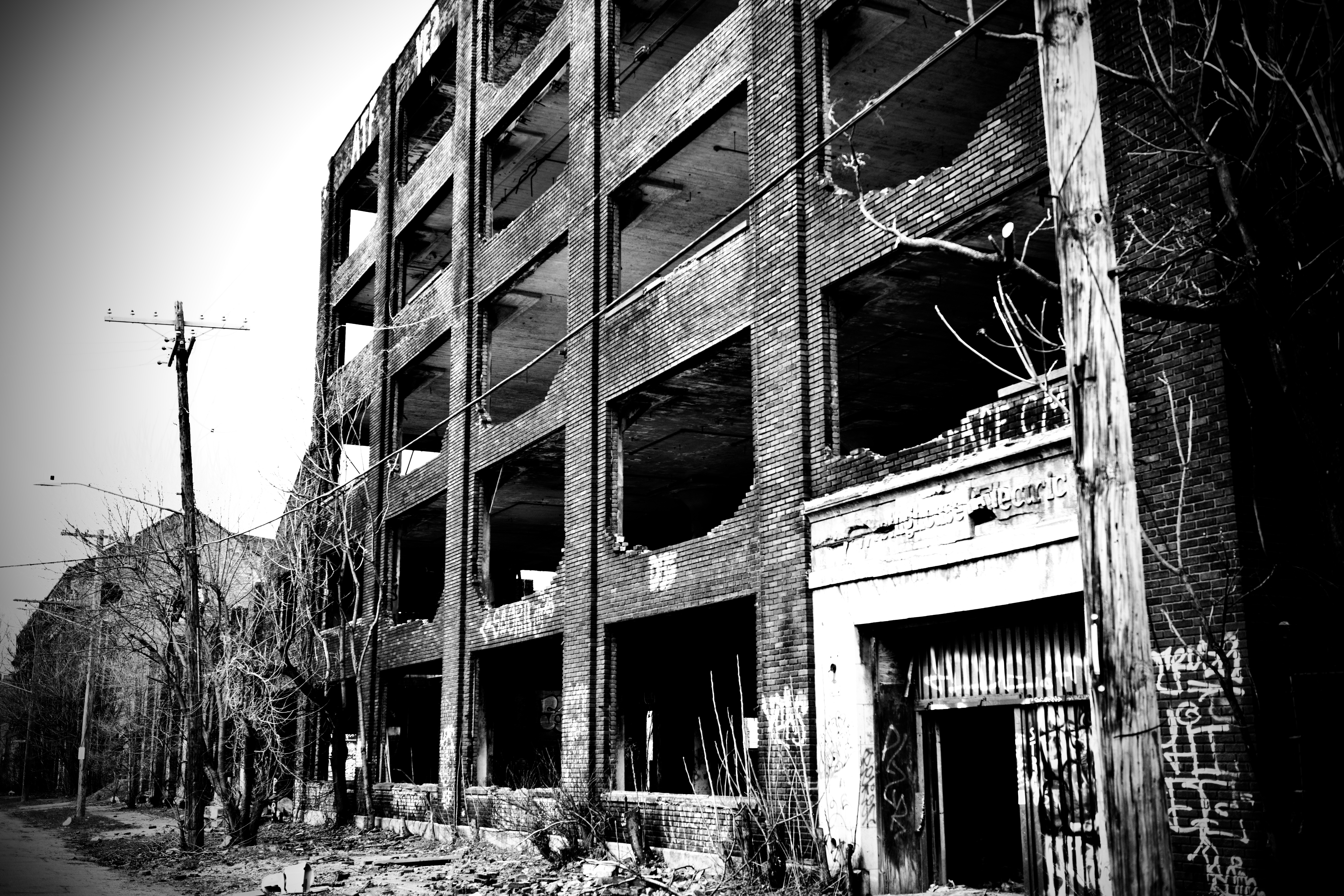 The face of an abandoned brick building.