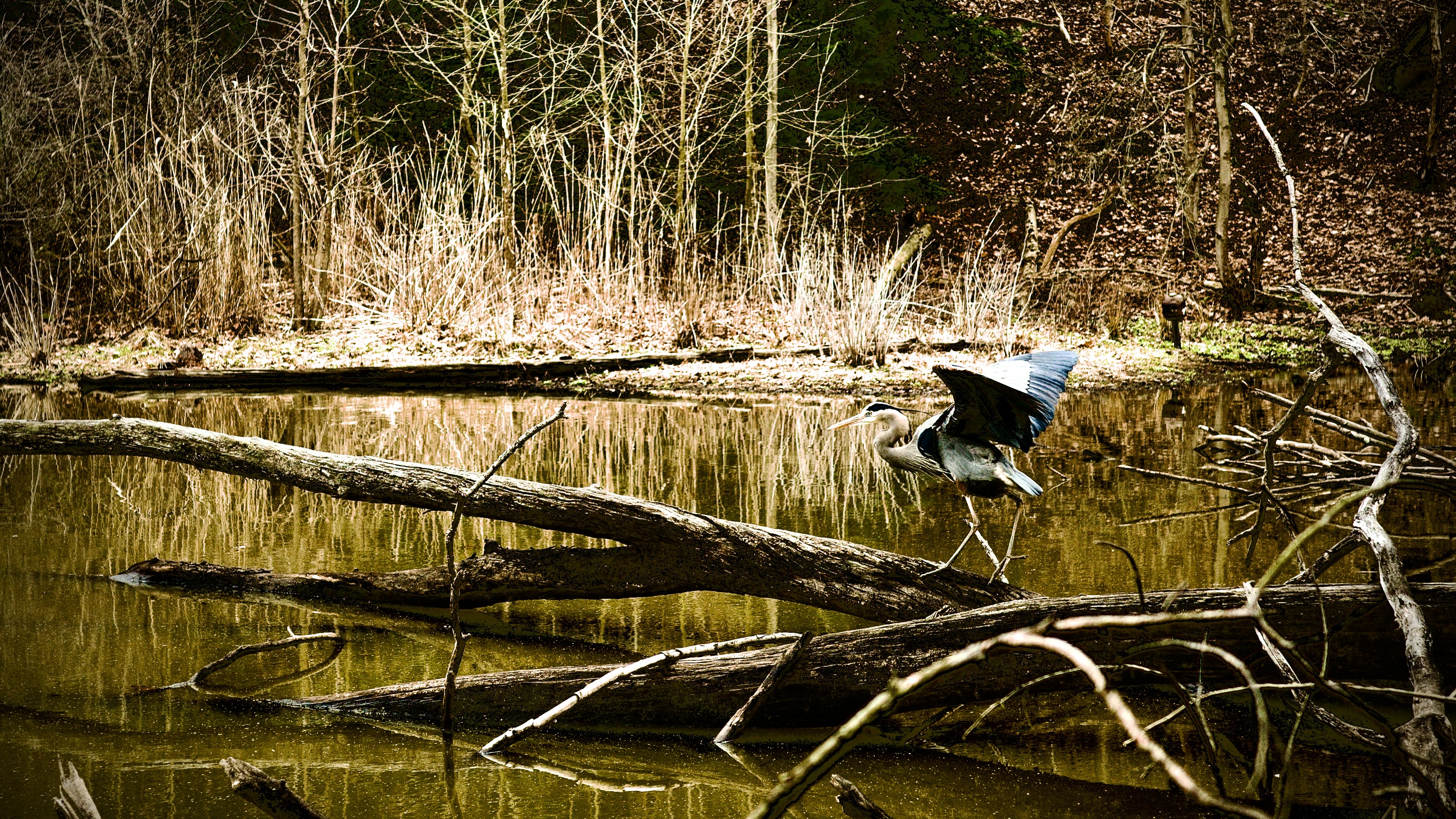 A blue heron balancing on a log.